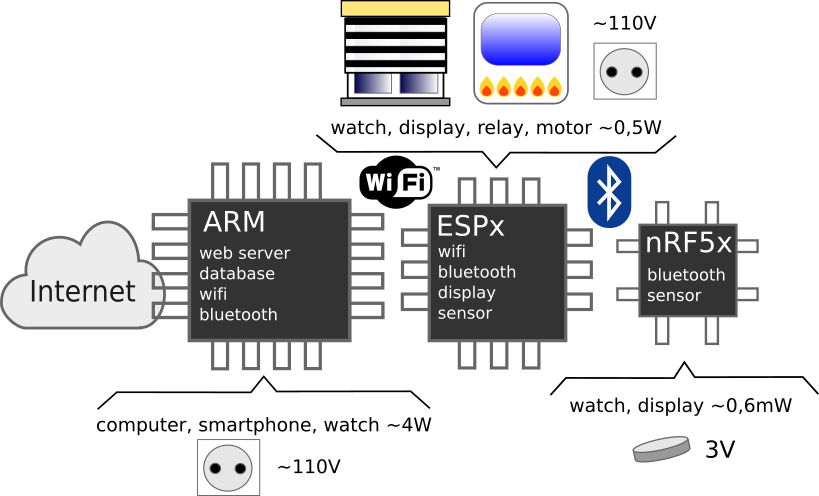 The operating system used is Debian. The main platform is a Raspberry Pi 3 Model B Plus Rev 1.3.Other platforms are used such as the Banana Pi M1, MK802, Raspberry Pi 1 Model B Rev 2 and Sheevaplug. They manage more than one gigabyte of daily updated data.They can perform home automation control based on weather forecast and sensors.