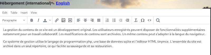 The content management of this website is an original development. Registered users get more features for collaborative management of the content. It can use several languages and all changes are recorded for each user over time. The graphical design of this website can be improved.